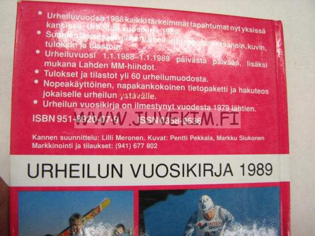| Saatavilla | 1 kpl | | Julkaisuvuosi | 1989 | | Sivuja | 320 | | Painos | 1. | | Kunto | K3 | | Sidonta/painoasu | Kuvitettu kovakantinen | | ISBN | 951-8920-07-9 | | Kielet | Suomi |