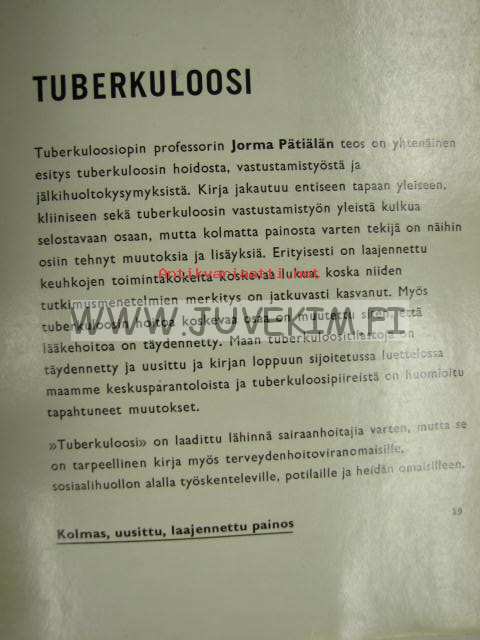 | Saatavilla | 1 kpl | | Julkaisuvuosi | 1965 | | Sivuja | 259 | | Painos | 3. | | Kunto | K3 | | Sidonta/painoasu | Sidottu (kovak.) | | Kielet | Suomi |