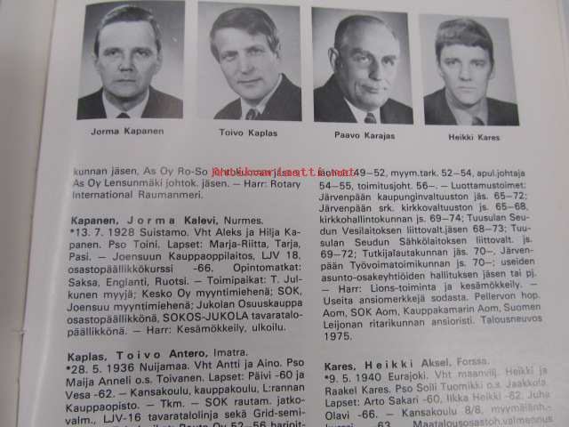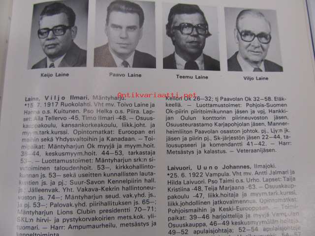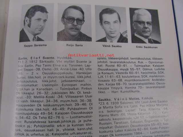 | Saatavilla | 1 kpl | | Julkaisuvuosi | 1977 | | Sivuja | 208 | | Painos | 1. | | Kunto | K3 | | Sidonta/painoasu | Sidottu (kovak.) | | ISBN | 951-99107-0-0 | | Kielet | Suomi |