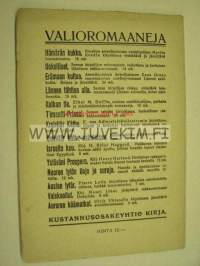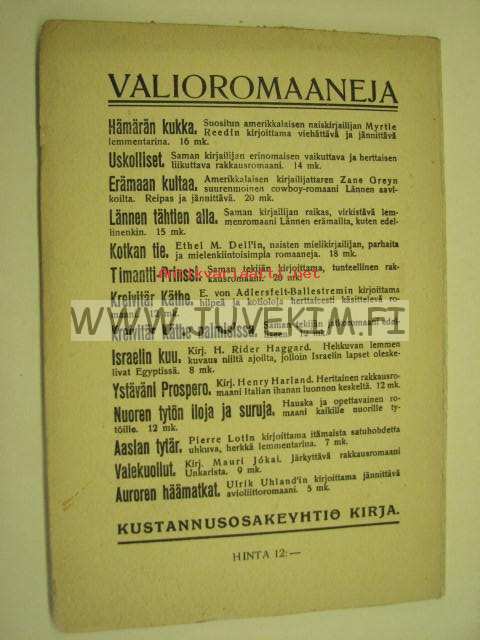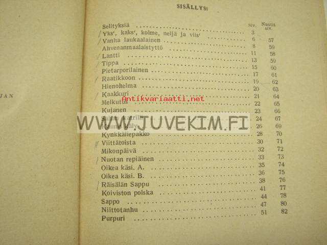 | Saatavilla | 1 kpl | | Julkaisuvuosi | 1922 | | Sivuja | 94 | | Painos | 1. | | Kunto | K3 | | Sidonta/painoasu | Nidottu (pehmeäk.) | | Kielet | Suomi |