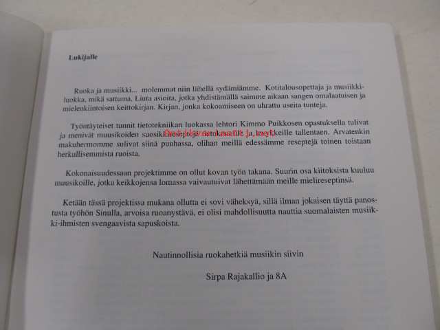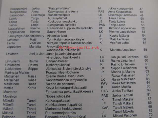 | Saatavilla | 1 kpl | | Julkaisuvuosi | 1997 | | Sivuja | 116 | | Painos | 1. | | Kunto | K3 | | Sidonta/painoasu | Nidottu (pehmeäk.) | | ISBN | 952-90-8841-8 | | Kielet | Suomi |