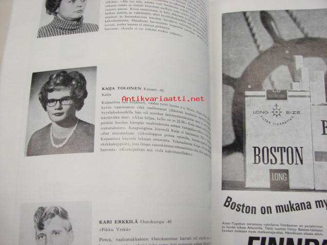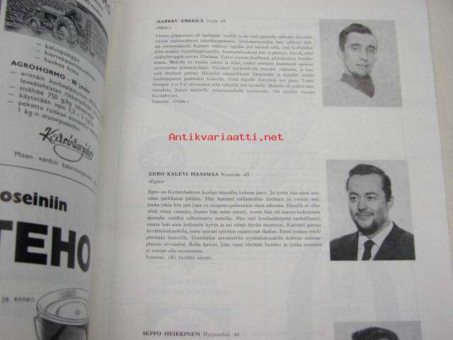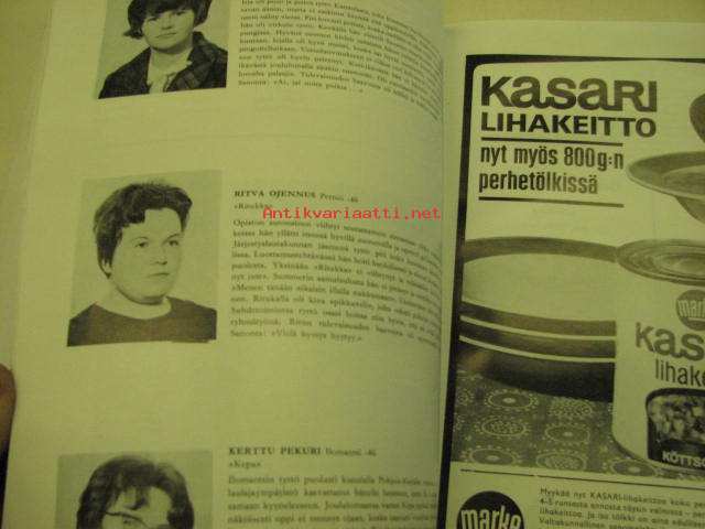 | Saatavilla | 1 kpl | | Julkaisuvuosi | 1966 | | Sivuja | 56 | | Painos | 1. | | Kunto | K3 | | Sidonta/painoasu | Nidottu (pehmeäk.) | | Kielet | Suomi |