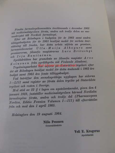 Pharmacopoea Nordica. Editio Fennica. Volumen I