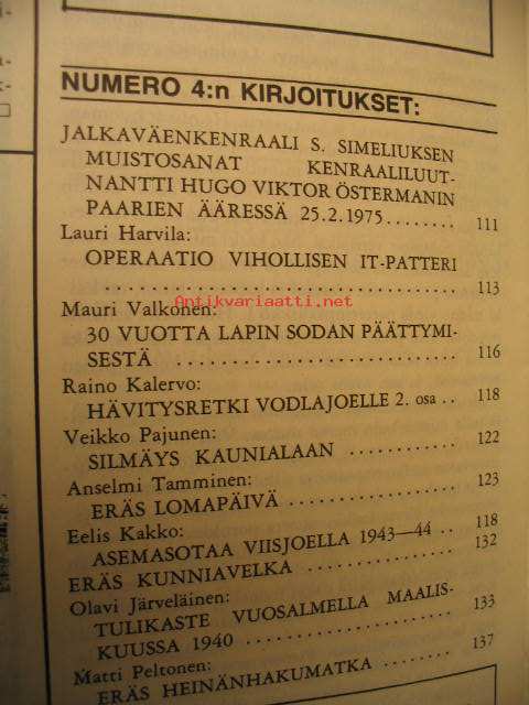 Kansa Taisteli 1975 nr 4, hävitysretki Vodlajoelle 2.osa, asemasotaa Viisjoella 1943-44. Olavi Järveläinen tulikaste Vuosalmella maaliskuussa 1940. Artikkeli 30 vuotta Lapin sodasta. Anselmi Tamminen: Eräs lomapäiväArtikkeli 30 vuotta Lapin sodasta.