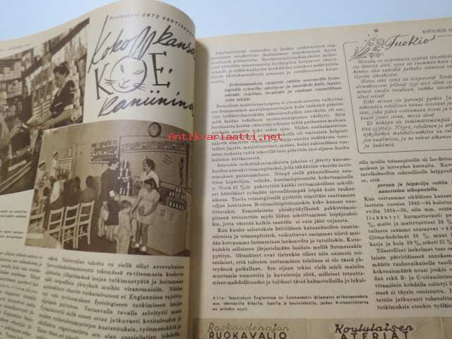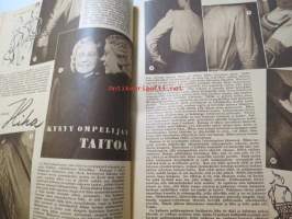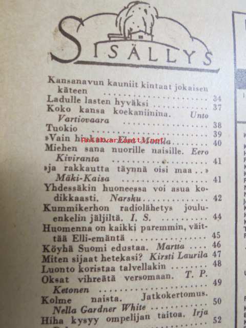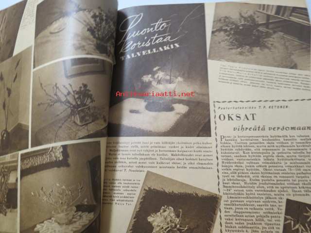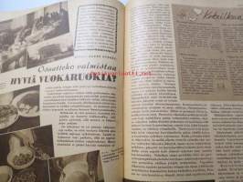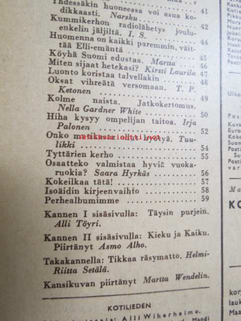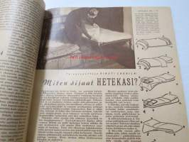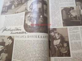 Kotiliesi 1947 nr 3 (kansi Martta Wendelin), miten sijaat hetekasi, yhdessäkin huoneessa voi asua kodikkaasti, luonto koristaa maljakon talvellakin, hiha kysyy
