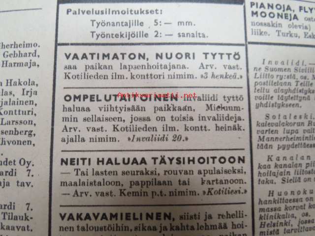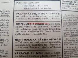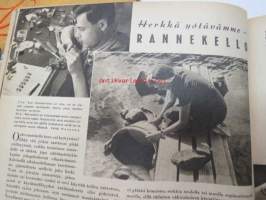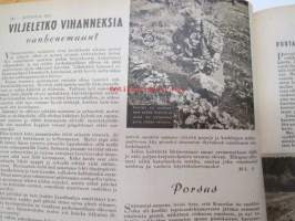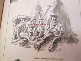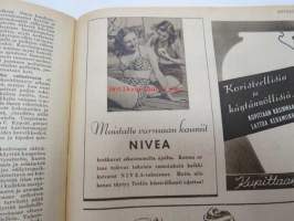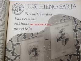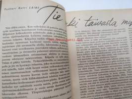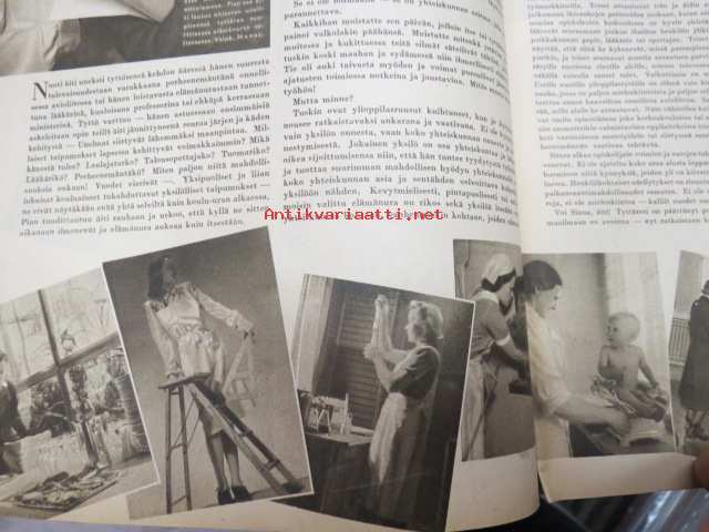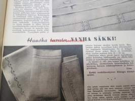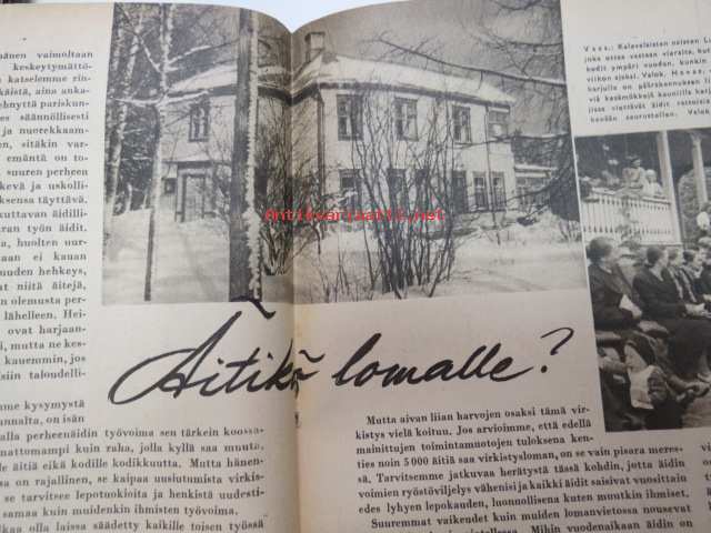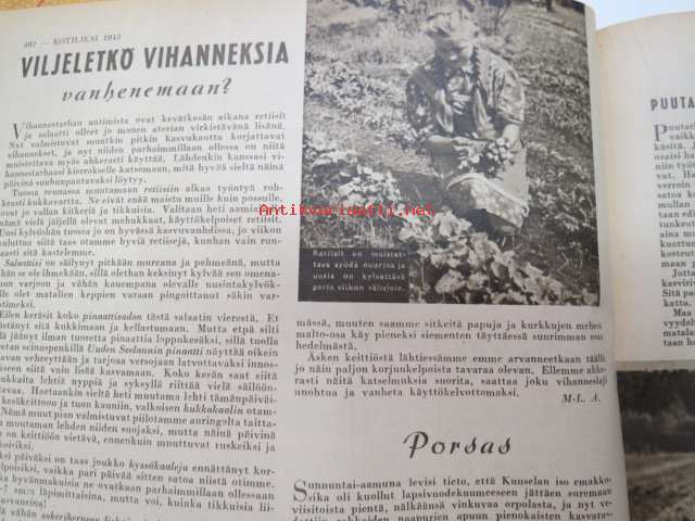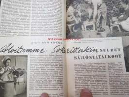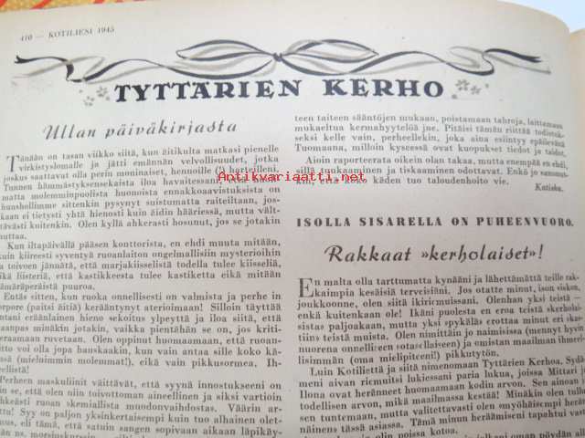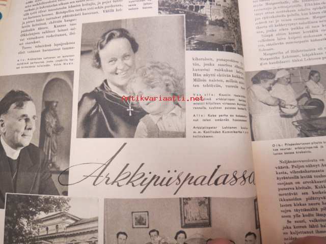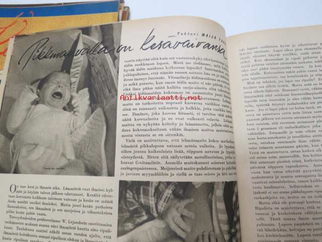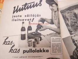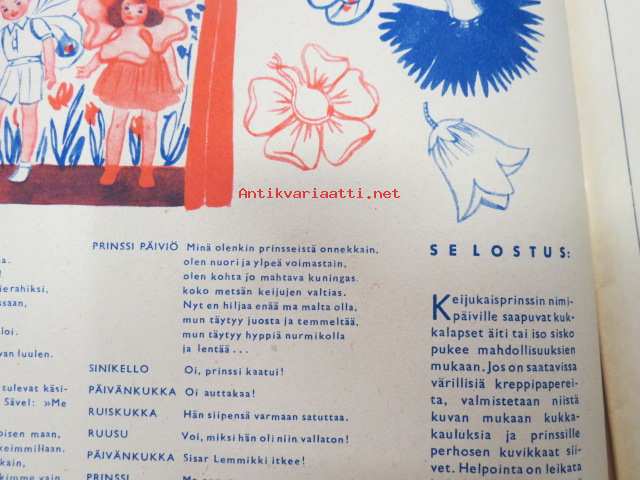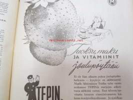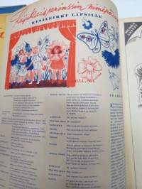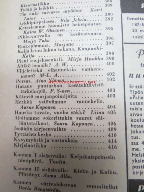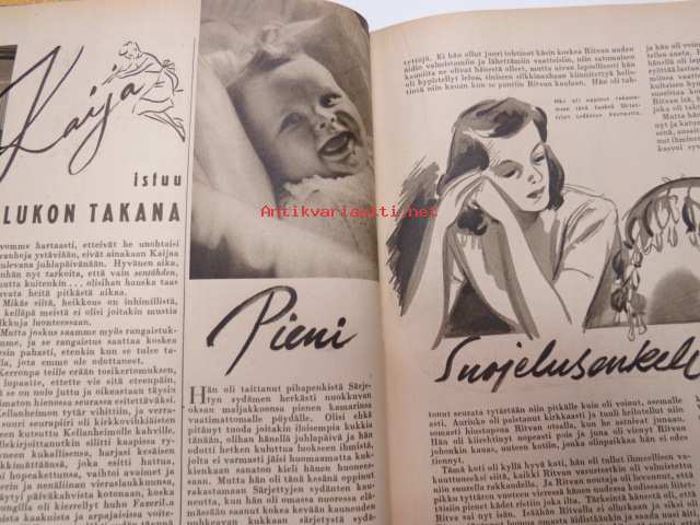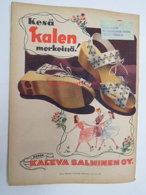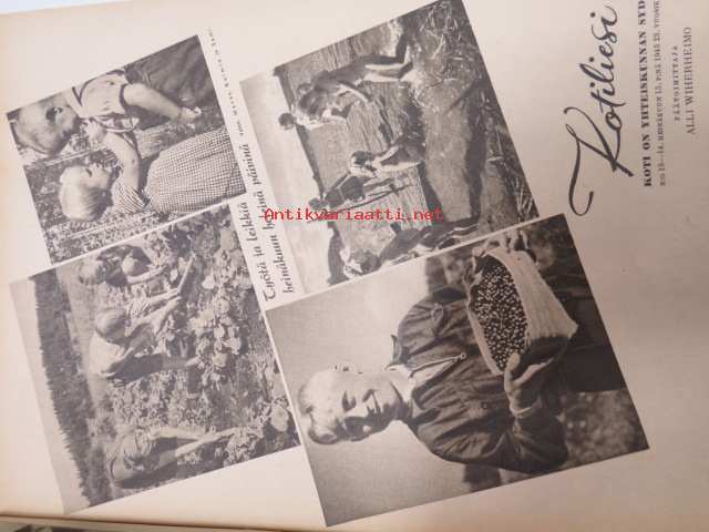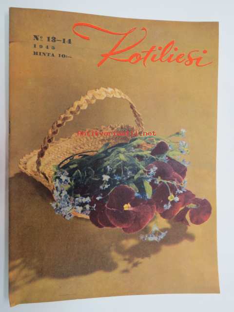 Kotiliesi 1945 nr 13-14, sis. mm. seur. artikkelit / kuvat / mainokset; Kansikuva - sommitellut Doris Bengström, Keijukaisprinssin nimipäivä - kesäleikki lapsille. Vaasaan leipää -mainos, Kas-Kas pullolakka, Tie auki taivasta myöten - ylioppilas - valkolakki, Arkkipiispalassa - Margaretha af Hällströmistä tuli arkkipiispatar Lehtonen, Huomista heinäpoutaa, Pikkuvauvalla on kesävaivansa, Äitikö lomalle, Hauska tavata - vanha säkki (saa uuden elämän), Aloitamme sokerittakin suuret säilöntätalkoot, Tyttärien kerho, Kieku ja Kaiku, Kaleva Salminen Oy Kale-korvikekengät, ym.21 x 29 cm.