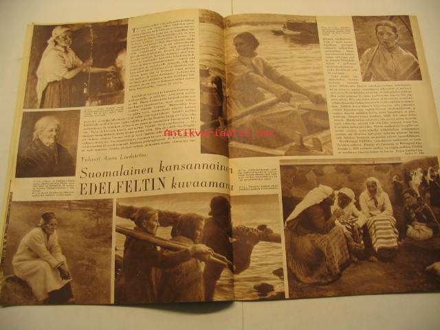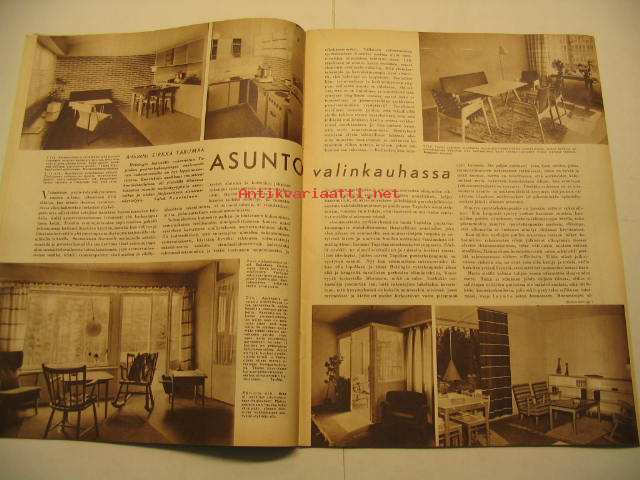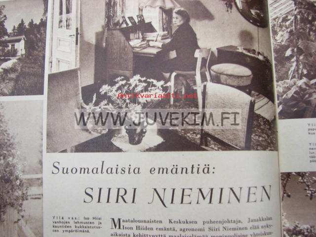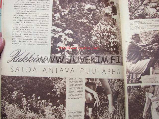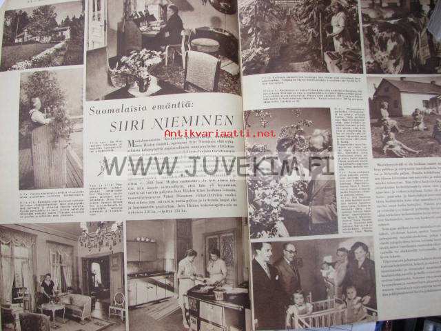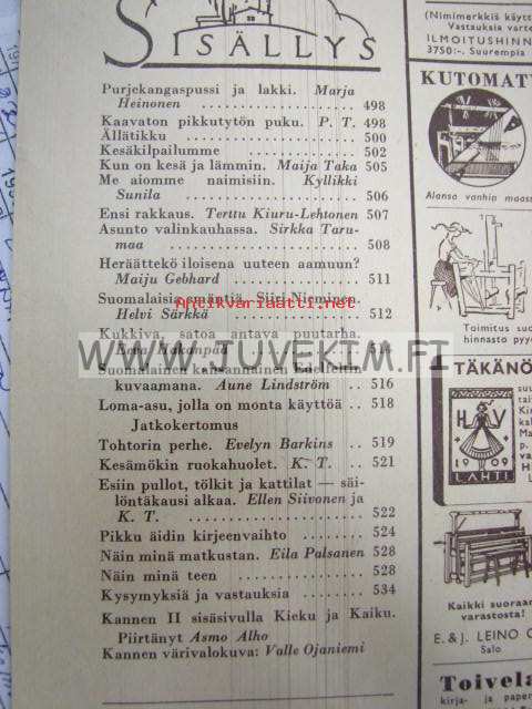 Kotiliesi 1954 nr 13-14, heinäkuu suomalainen kansannainen Edelfeltin kuvaamana, suomalaisia emäntiä: Siiri Nieminen (Janakkala), säilöntäkausi alkaa, Tapiolan uusia asuntoja sisustusnäyttely: Nurmesniemi, Sokos, Asko, Boman, Te-Ma . Kieku ja Kaiku sarjakuva. Lassila & Tikanoja mainoksessa esitellään turkulainen kauppias Antti R. Salonen