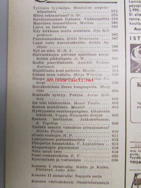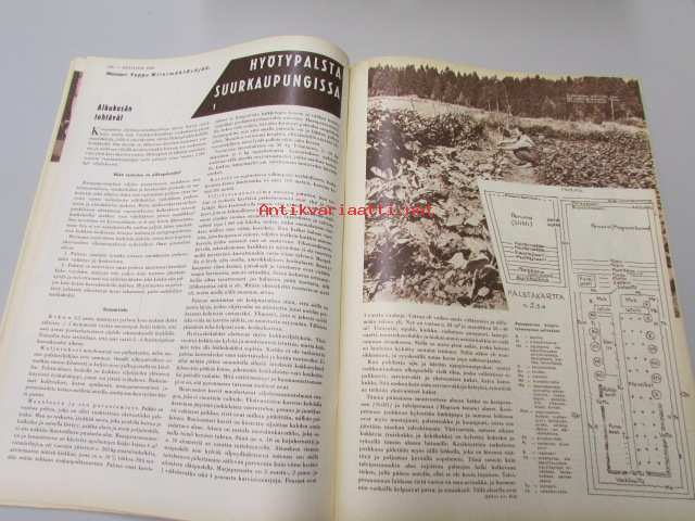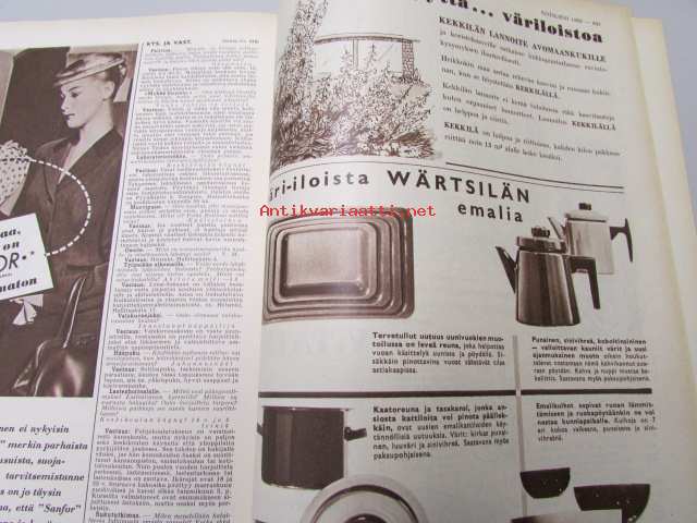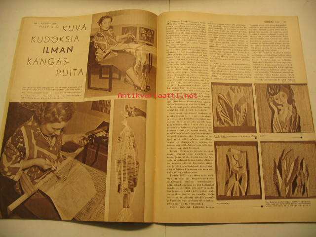 Kotiliesi 1959 nr 10, hyötypalsta suurkaupungissa osa 1, miesten muoti, Wärtsilän emali-mainos, Mary Olki: kuvakudoksia ilman kangaspuita, vieläko osaatte