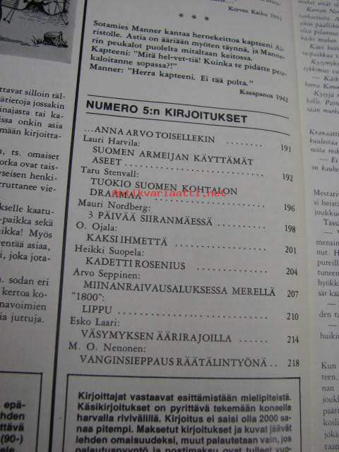 Kansa taisteli 1976 nr 6 (kannessa Mannerheim, Heinrichs ja Öhquist), Lauri Harvila: Suomen armeijan käyttämät aseet 1918-1945, kranaatinheittimet, 3 päivää Siiramäessä, Arvo Seppinen: miinanraivauksessa merellä, tarjoilijana Mars