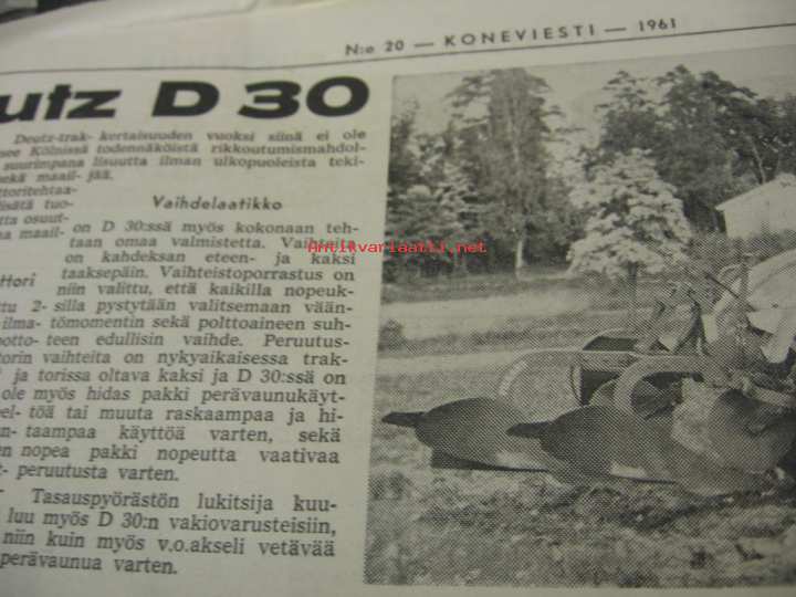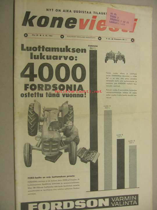 Koneviesti 1961 nr 20 Kannessa: 4000 Fordson -traktoreita ostettu tänä vuonna. Artikkeli : Deutz D 30. Fiat-traktoreista mainos, 5 eri mallia.