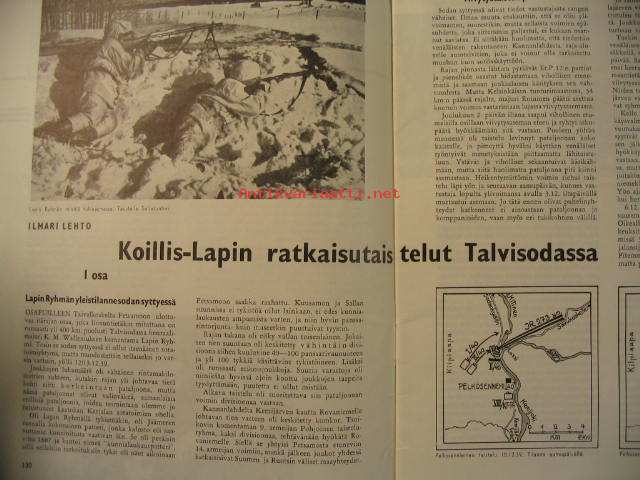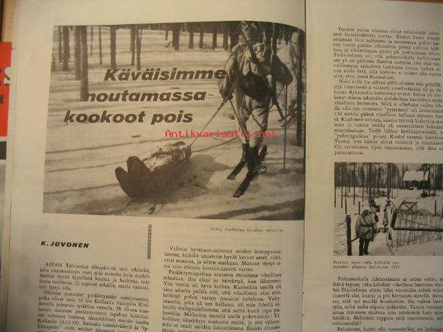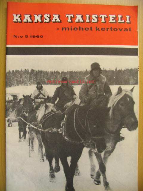 Kansa Taisteli 1960 nr 5: Erkki Kario - Olemme väsyneet eripuraisuuteen, Ilmari Lehto - Koillis-Lapin ratkaisutaistelut Talvisodassa osa I, Niilo Rajaharju - Kun aisat rusahtivat poikki, Sirkka tolvanen - Lotta- schwesterinä sotasairaalassa Peräpohjolassa, V. Tiikanen - Eräs ihme, K. Juvonen - Käväisimme noutamassa kookoot pois, P. Manninen - Yläsommeen liukuradalla, Martti Haapamäki - Rauhan tulo Taipaleella, Matti Mikkola - Kohtalon saatto osa X, Kaarlo Erho - Ersäs kommellus sotasairaalassa, Wäinö Wainio - Talvisodan muistoja, 21 x 30 cm.