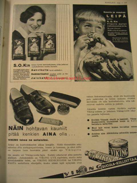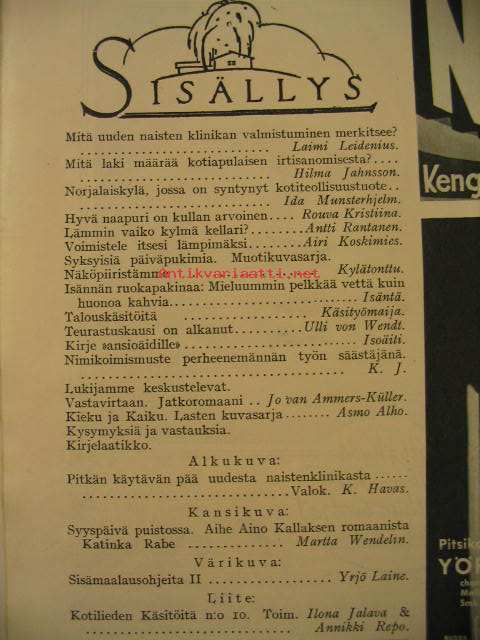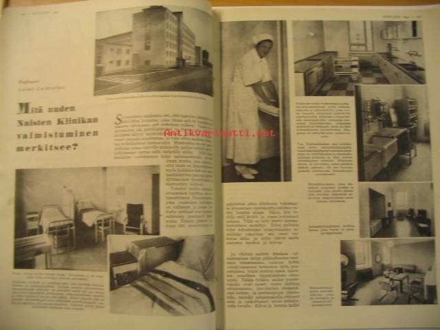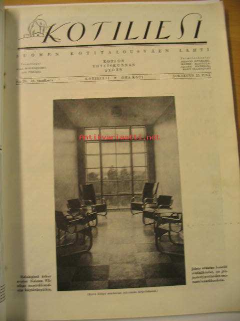 Kotiliesi 1934 nr 20 lokakuu 1934. kansi Martta Wendelin, lämmin vaiko kylmä kellari, norjalaiskylä, jossa on syntynyt maailmankuulu kotiteollisuustuote (mustavalkoiset käsinneulotut kintaat), mieluummin pelkkää vettä kuin huonoa kahvia, teurastuskausi on alkanut, Kotilieden käsitöitä nr 10, Helsingin Naistenklinikka - kuvia Aalto huonekalut . Mainos: Nokia -kalossi.Kannen kuva Martta Wendelin.