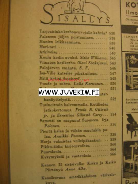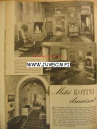 Kotiliesi 1949 nr 20 Lokakuu. Takakannessa värikäs piirretty Silo -mainos. Piirretty nelivärimainos Fazer -makarooni. Ajankuvaa, mainoksia ja ruokaohjeita ( mm voileipäkakku savusilakka -täytteellä) vuodelta 1949. Irja Palonen : Sametti on saapunut Suomeen . Kodin sisustuksia : mitä kotini ilmaisee mm Kaisa Kallion , Osmo Vesikansan ja Joy Lindforsin olohuoneista kuvat. Emäntä Aili Palojärvi esitellään.