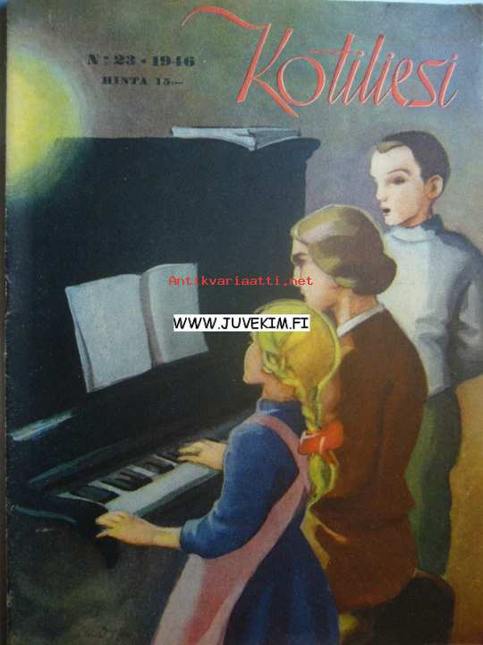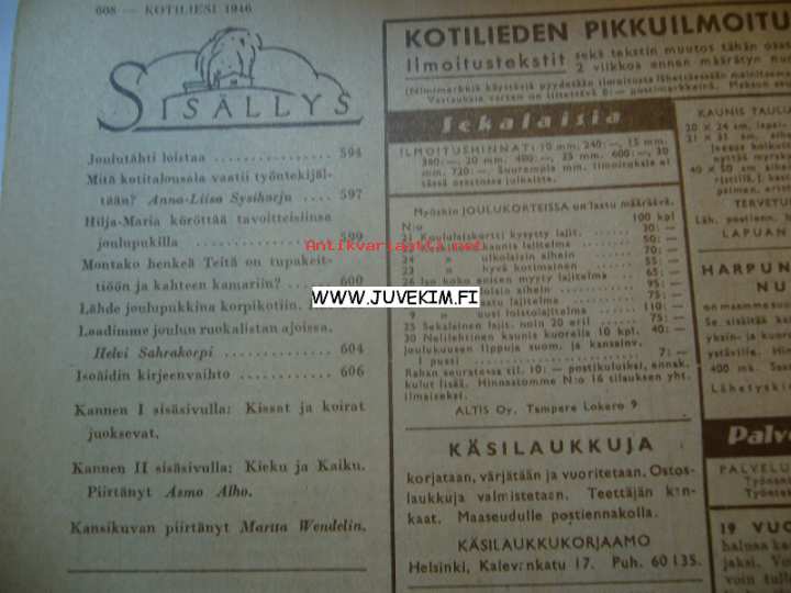 Kotiliesi 1946 nr 23, 1.12.1946, Kansikuva Martta Wendelin, Askartele kissa, Tupakeittiö ja kaksi kamaria, Joulupukkina korpikotiin, Jouluruokalista, ym.