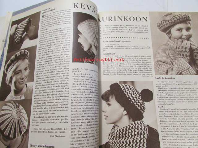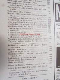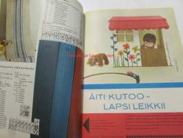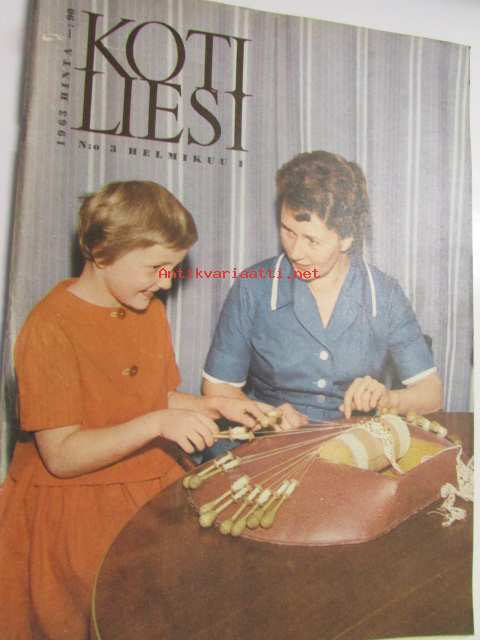 Kotiliesi 1963 nr 3 Helmikuu Kannessa kuva - pitsinnypläystä opetetaan pikkutytölle, Ompeluohjeita - vuoteen taustalle seinän suojus, Koti observatoriossa (perhe Kivinen Nurmijärvi), Perhekuvissa Teodor ja Hilda Yrjönen Porvoo - Jalmari ja Lyyli Suvanto Perniö, Käsityöohjeissa baskerimalleja, ym.