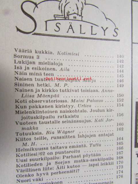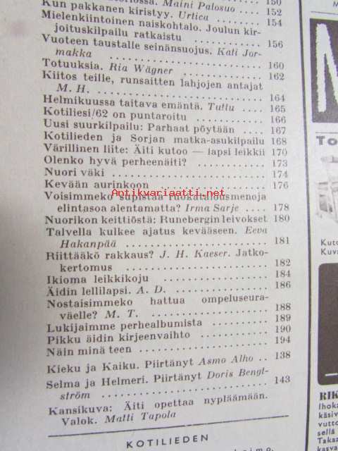 Kotiliesi 1963 nr 3 Helmikuu Kannessa kuva: pitsinnypläystä opetetaan pikkutytölle. Ompeluohjeita: vuoteen taustalle seinän suojus. Koti observatoriossa (perhe