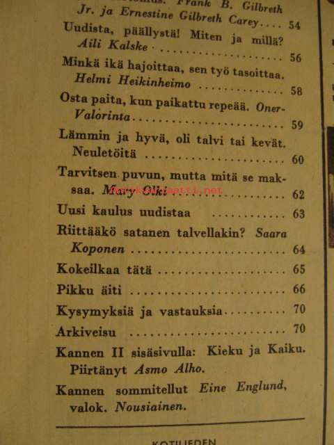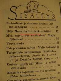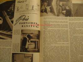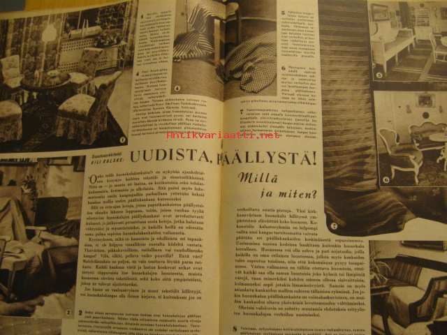 Kotiliesi 1950 nr 2, sisustusarkkitehti Aili Kalske: Uudista, päällystä, millä ja miten?, pois portaiden rasitus, monen mielen myssy