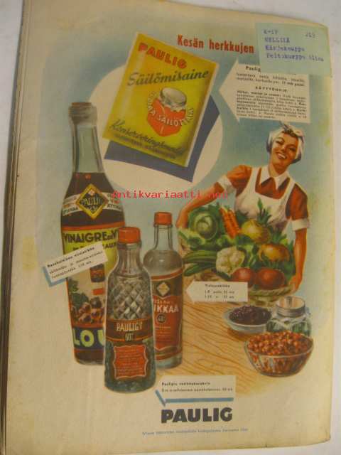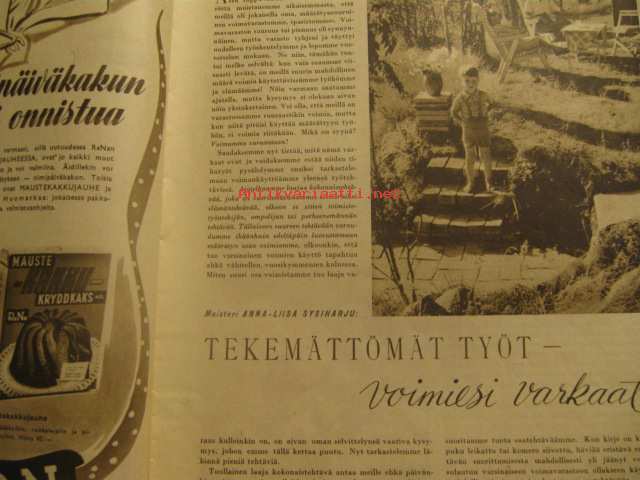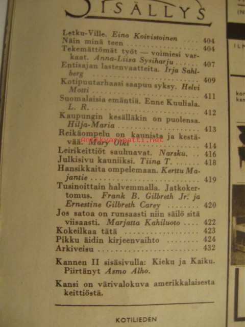 Kotiliesi 1949 nr 16, Elokuu . Emäntä Enne Kuuliala esitellään. Partiolaisten leiritoiminnasta runsas kuvasarja. Takakannessa piirretty värimainos Paulig säilömisaine. Artikkeli kuvineen entisajan lastenvaatteita Turun Linnan näyttelyssä v. 1949. Hansikkaiden teko-ohje. Reikäompele -malleja.
