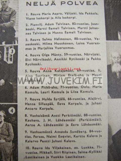 Yhtyneet Kuvalehdet Oy, 1949Neljän sukupolven perhekuvia, esimerkkejä nimistä: Väkijoki, Talvinen, Heimonen, Rytikoski, Katajamäki, Pitkä-aho,Syrjälä, Perkiömäki, Sundberg, Kaleva, Viljakainen