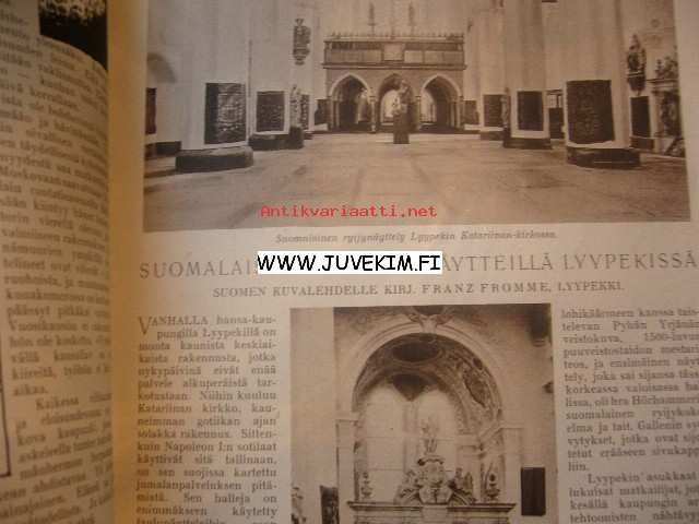 Suomen Kuvalehti 1922 nr 34 Ilm. 26 elokuu 1922 . Suomalainen ryijynäyttely Lyypekin Katariinan kirkossa. Kultahääpäiväkuva Emma Emilia ja Johan Petter Tiensuu.
