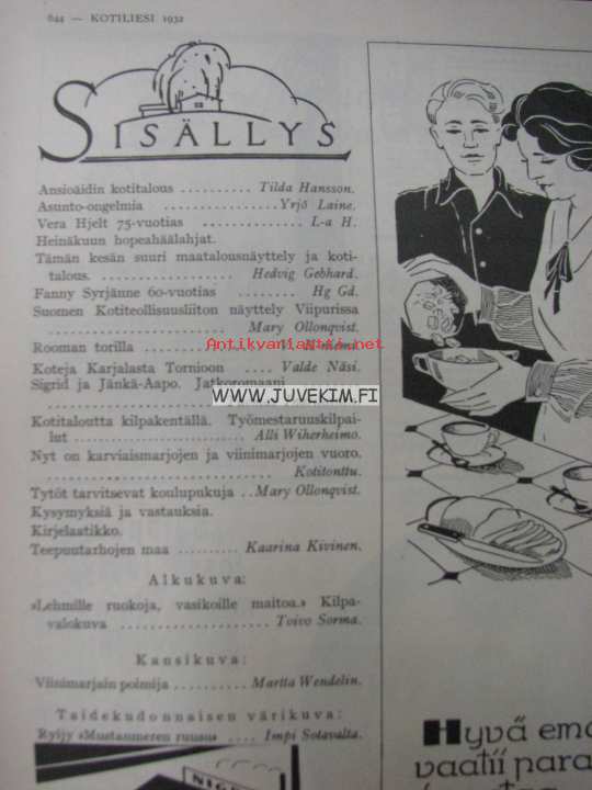 Kotiliesi 1932 nr 16 (kansi Martta Wendelin ) Elokuu 1932. Värikuvassa ryijy Mustan meren ruusu, suunn. Impi Sotavalta. Suomen Kotiteollisuusliiton näyttely Viipurissa 1932, mustavalkokuvassa mm. Helmi Vuorelman Kotikutomon kansallispukuja. Artikkeli kuvineen: Koteja Karjalasta Kuopioon. Kuva ja lyhyt artikkeli : Vera Hjelt 75-vuotias.
