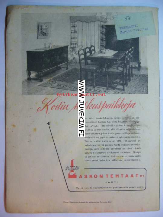 Kotiliesi 1946 nr 17 Kansikuva Martta Wendelin, vapautuva linnanneiti - Fredrika Bremerin lapsuuden ja nuoruuden tarina, tasku koristaa ja palvelee, suomalaisia emäntiä Inkeri Ilmarinen - Mouhun kartano (Iitti)