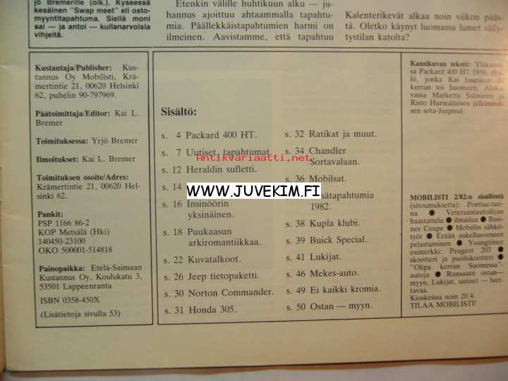 Mobilisti 1982 nr 1. Lehti vanhojen autojen harrastajille, sisällysluettelo löytyy kuvista.