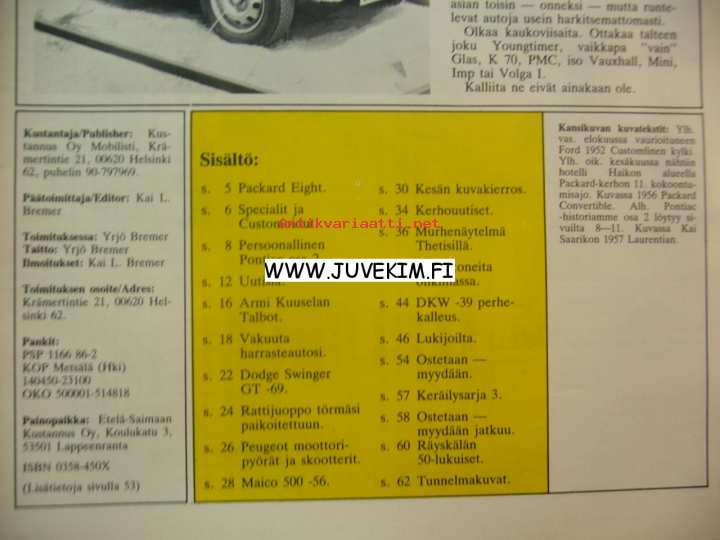 Tässä Moblisti-lehdessä mm. Packard Eight 1948 entisöinnistä kannustustarina., Armi Kuuselan Talbot, DKW 1939 puukori, sukellusvene Thetiksen tuho 1939. Paljon kuvia Pontiac-autoista. Keräilysarjakuvassa Saab 92 B vm 1954.