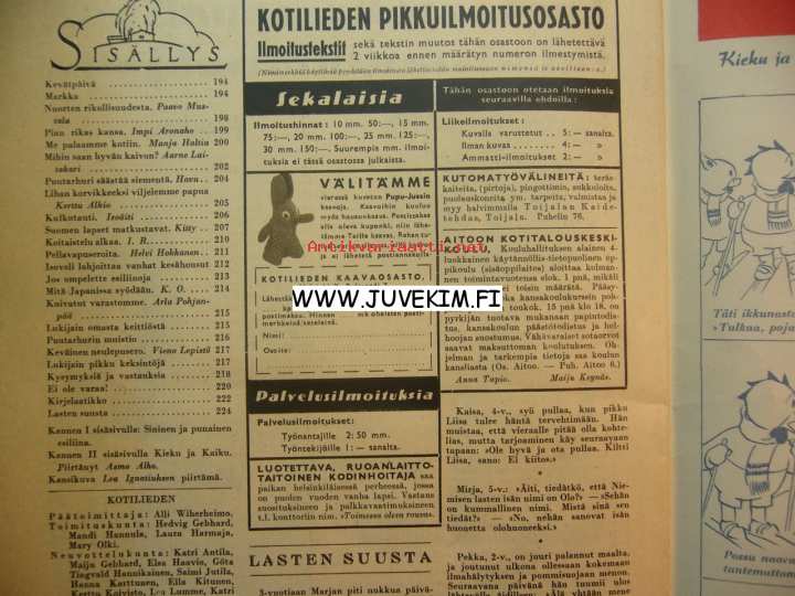| Saatavilla | 2 kpl | | Julkaisuvuosi | 1942 | | Kunto | K3 | | Sidonta/painoasu | Lehti | | Kielet | Suomi |