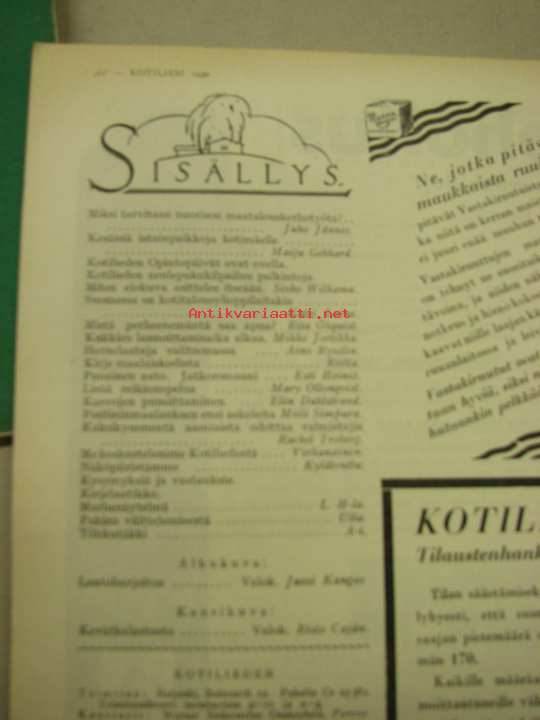 Kotiliesi 1930 nr 7. Huhtikuu 1930. Kansikuvasssa Mies ja koira talvinuotalla. Runsaasti vuoden 1930 mainoksia, mm Ford Tudor -vaunu. Juho Jännes artikkeli : Miksi tarvitaan nuorison maatalouskerhotyötä. Ford -mainos ( koko sivun mainoksessa valokuvassa Ford Tudor ) Stadion -kahvimainos. Littoinen ( verkatehdas) mainos : valitkaa kangas joka ei kutistu sateella. Mary Ollonqvist reikäompelumalleja. Takakannessa värikäs Finlayson-mainos.