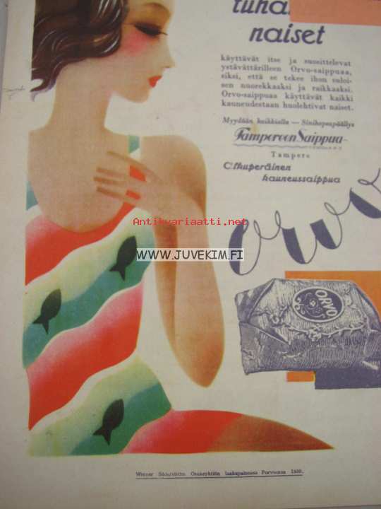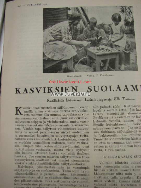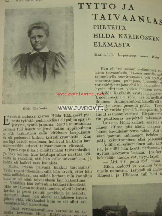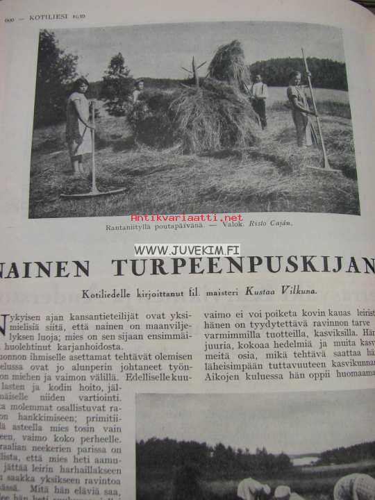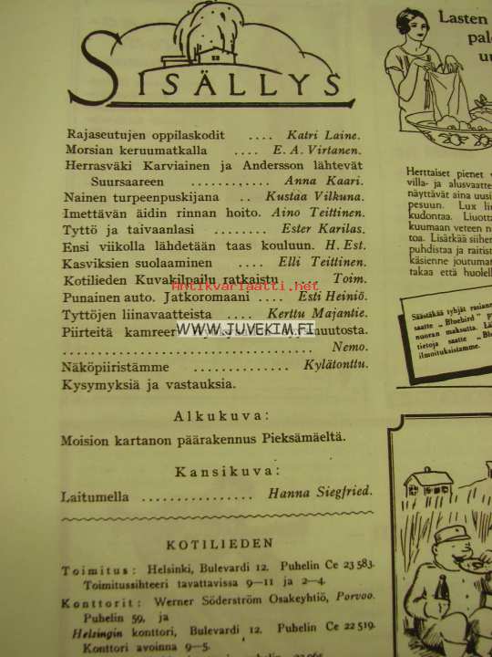 Kotiliesi 1930 nr 16 Elokuu 1930. Kaunis kansikuva: laitumella, piirtänyt Hanna Sigfried . Artikkeli kuvineen Hilda Käkikoski . Takakannessa tyylikäs mainos