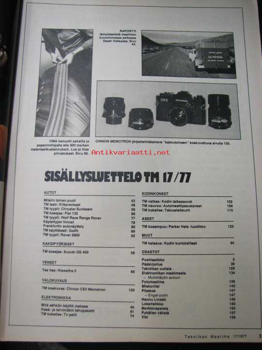 Tekniikan Maailma 1977 nr 17 TM testaa 1977: Fiat 132, Rover 2600, Pikku-Chrysler sekä vertaa kitka- ja nastarenkaita. Vuoden 1977 TV -pelit ja kuntoilijan välineet testissä. Suzuki GS 400. Polttogeneraattorin rakennusohje. Mahonkinen kanootti -teko-ohje