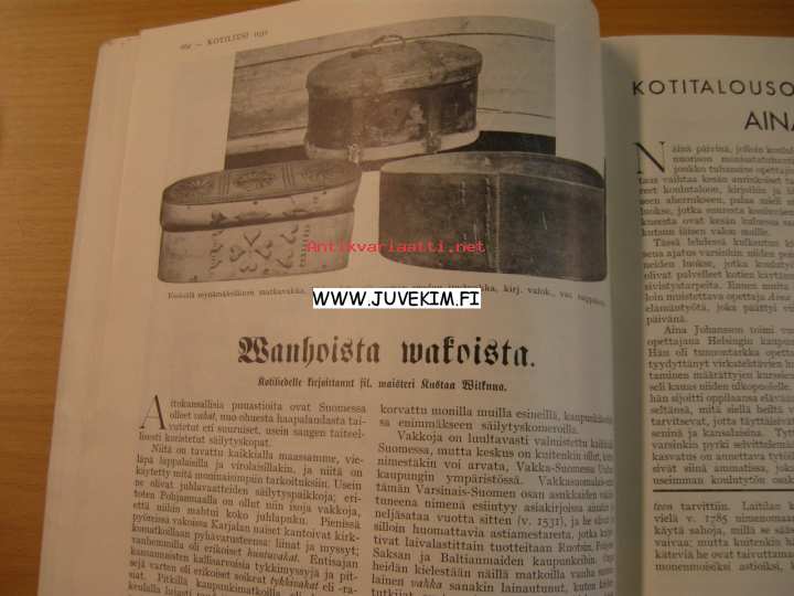 Värikuva mattomallista: Karvalankamatto suunn. Eva Anttila. Artikkeli ja kuva: kotitalousopettaja Aina Johansson. Artikkeli kuvineen: Wanha vakka (eväsvakka)
