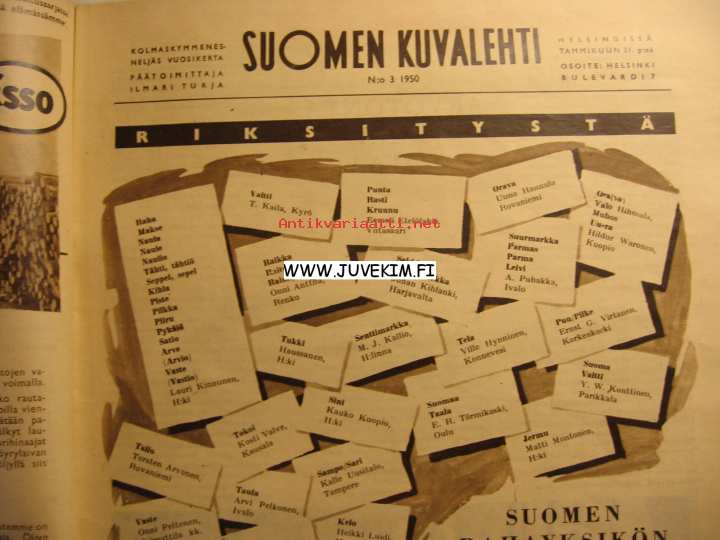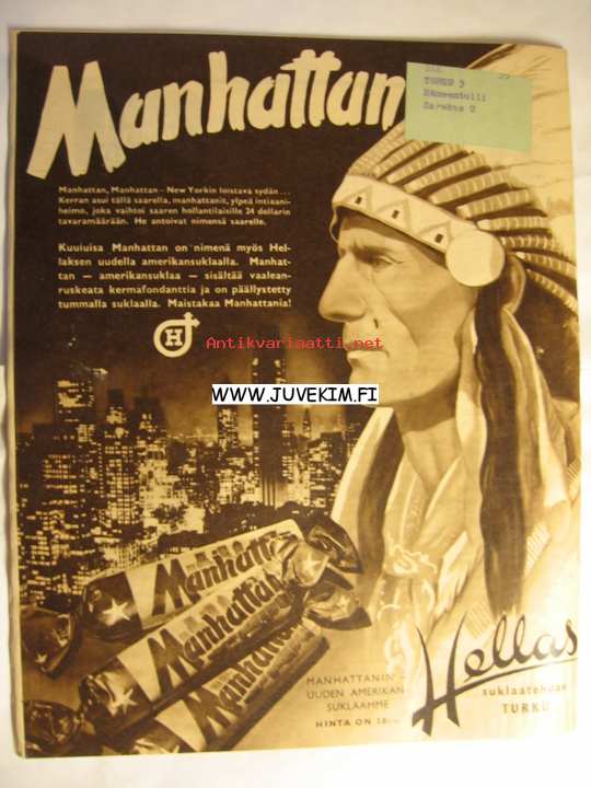 Suomen Kuvalehti 1950 nr 3 Takakannessa Hellas Manhattan mainos, Intiaanin kuva)