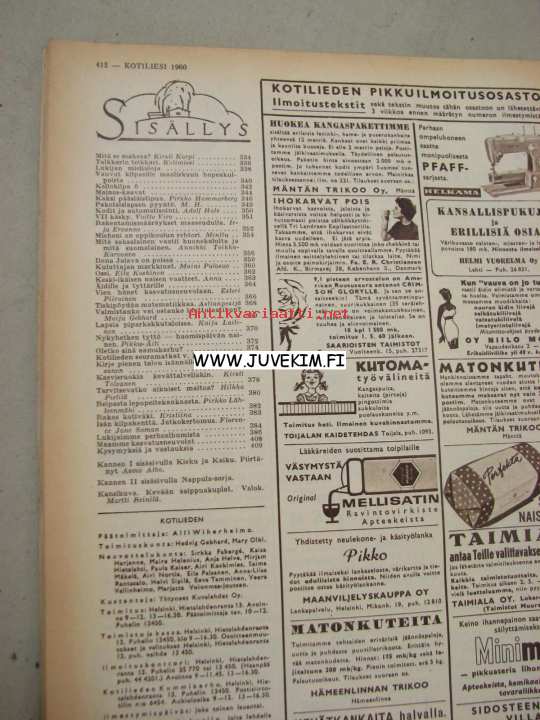 Kotiliesi 1960 nr 6, maaliskuu. Mieheni on oppikoulun rehtori kirjoittaa Inge Apajalahti. Ilona Jalava in memoriam. Mainos: Sarpaneva-pata ( Saturnus-pata)