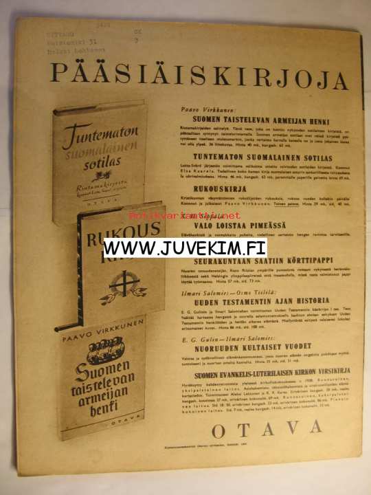 | Saatavilla | 1 kpl | | Julkaisuvuosi | 1942 | | Sivuja | 40 | | Kunto | K2 | | Sidonta/painoasu | Lehti | | Kielet | Suomi |