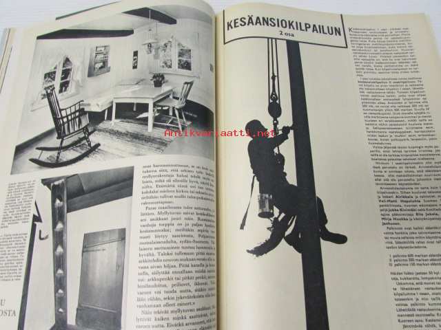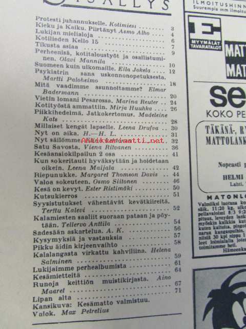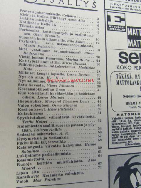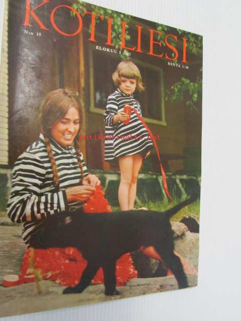 Kotiliesi 1967 nr 15 Elokuu 1967 ajankuvaa, Suomeen kuin ulkomaille - Visavuori, Purnu ja Kalela, vietin lomani Pesarossa (Marja-Liisa Huttunen ja Aune Jokilehto), savolainen vesimyllytupa kesä-asuntona. Viisi sukupolvea Eva Hannus , Ellen Helenius , Eila Leinivaara , Leena Saarela ja Timo Saarela