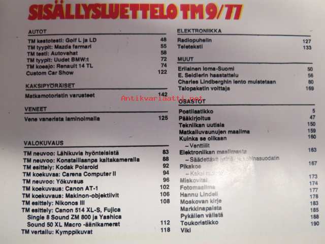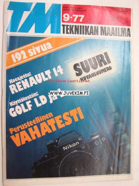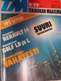 Tekniikan Maailma 1977 nr 9 Tm koeajaa Renault 14, Golf LD ja L, Mazda Farmari, vuoden 1977 uudet BMW:t 700-sarja. Runsaasti valokuvaus -aihetta. TM testaa: autovahat