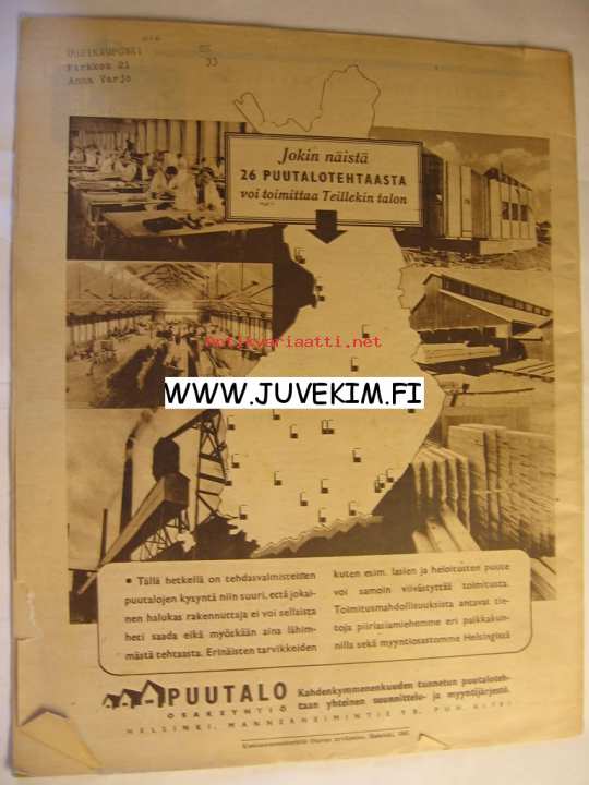 | Saatavilla | 1 kpl | | Julkaisuvuosi | 1945 | | Kunto | K2 | | Sidonta/painoasu | Lehti | | Kielet | Suomi |