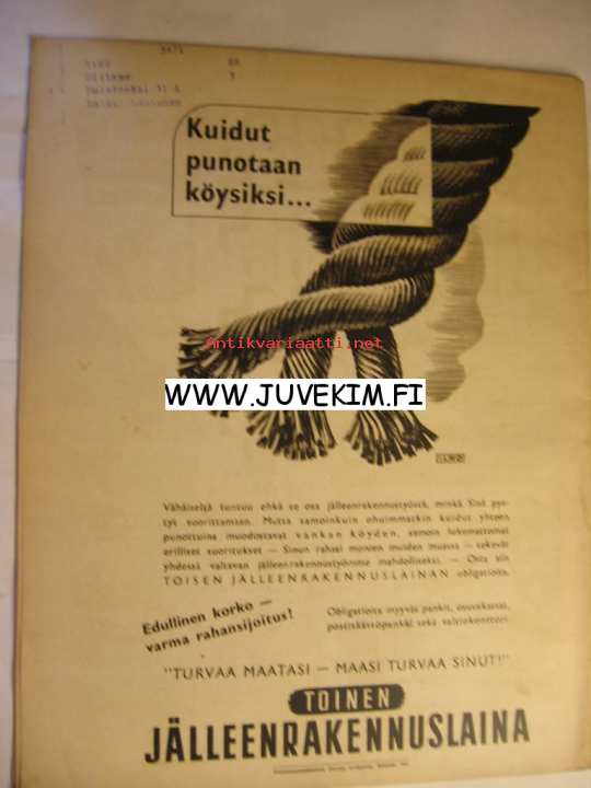 | Saatavilla | 1 kpl | | Julkaisuvuosi | 1941 | | Sivuja | 32 | | Kunto | K3 | | Sidonta/painoasu | Lehti | | Kielet | Suomi |