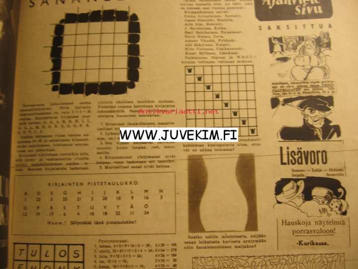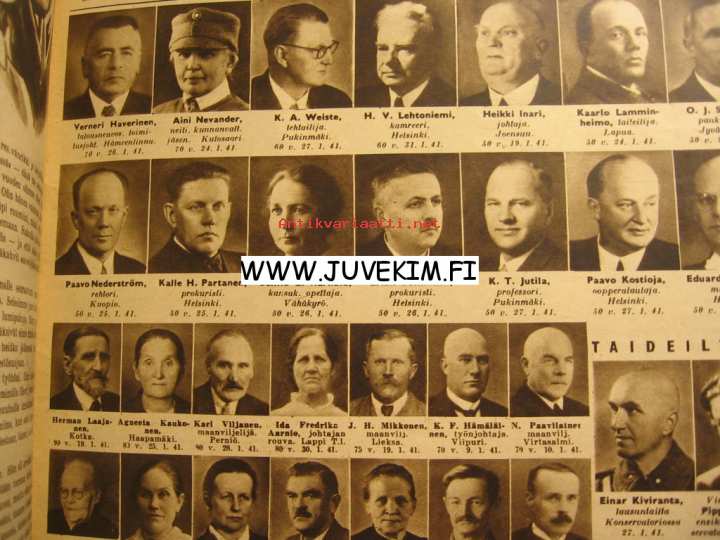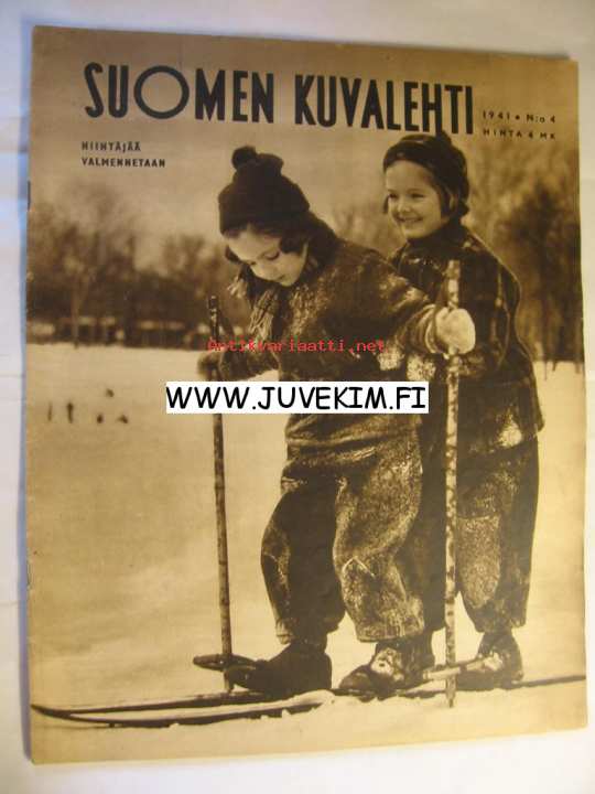 Suomen Kuvalehti 1941 nr 4. Kuvasarja: talvinen Koli. Punaisen Ristin proteesipaja. Onnittelukuvissa mm. Hanna Pöysälä 70 vK.A.Weiste 60 v, Kaarlo Lamminheimo 50 v, Maria Pääskynen 70 v, Jenny Mohell 50 v. M.F. Martelius 60 v. K.T.Jutila 50v. Kultahäät työmies Otto Tiitinen ja vaimonsa Miina (os Korhonen) Viitasaari..
