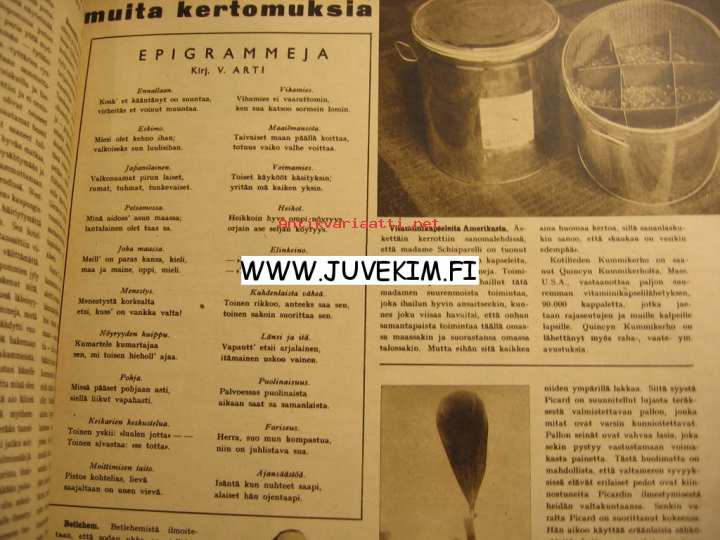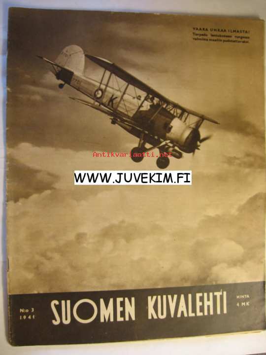 Suomen Kuvalehti 1941 nr 3, Kansikuvassa Torpeedo lentokoneen rungossa valmiina pudotettavaksi. Aiheita : osto- ja myyntiliike Pinnebergin pörssi, Robert Baden-Powell . Aukeaman verran kuvia ja juttua vuoden -40 suomalaiset keihäänheittäjät mm Tapio Rautavaara . Tasavallan hallitus 15 valokuvaa.