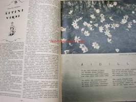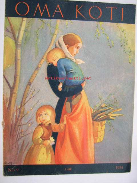 Oma Koti 1934 nr 9 toukokuu (kansi Martta Wendelin), Äitini virsi, monivuotisia kukkia, Morsiamen lakanat somistetaan, Puikot ja villalankaa, Kieku ja Kaiku