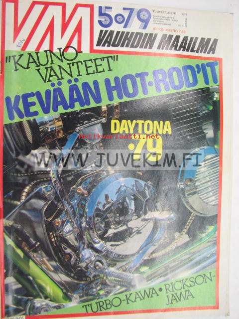 Vauhdin Maailma 1979 nr 5 -mm. Kevään merkittävin autouutuus! Datsun 120A, Autosuunnistus, Tuhti tehopaketti Turbo Kawasaki Z 1000, BMW M1 auto jota on jo odotettukin, F1 Etelä-Afrikan GP ferrari iskee takaisin, HOd Rod Show Tukholman tuliset, Daytona -79.21 x 29 cm.