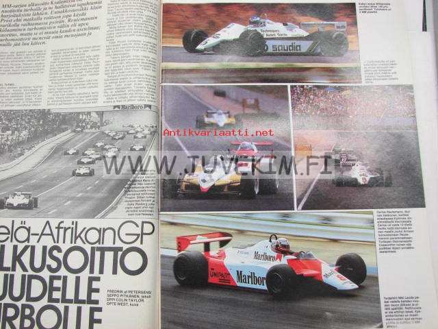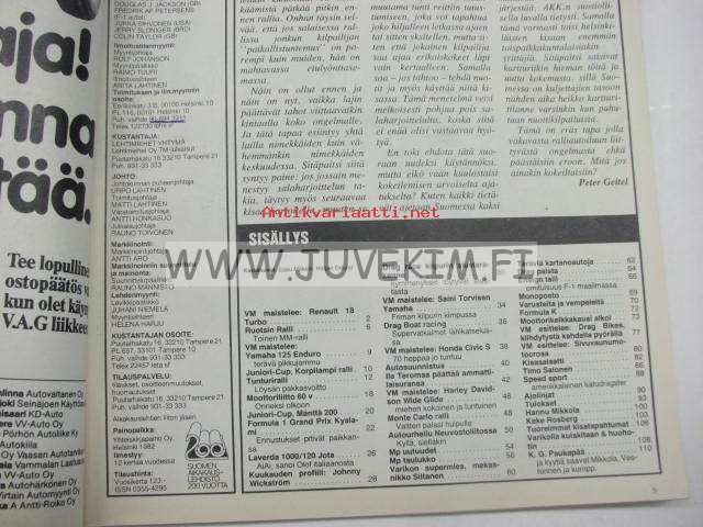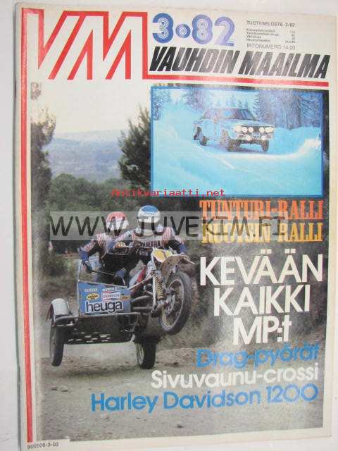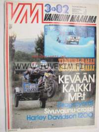 Vauhdin maailma 1982 nr 3 -mm. Speed sport Roadster katudragsteri, Autourheilu Neuvostoliitossa - Suuressa maassa tapahtuu, Monte CarloRalli MM, Harley Davidson FXWG Wideglide, Ila Teromaa lopettaa ura päätökseenEsittelyssä Drag Boat racing, Kuukauden profiili Johnny Wickström, F1 Etelä-Afrikan GP alkusoitto kuudelle Turbolle, XVII Tunturiralli, Renault 18 Turbo.21 x 29 cm.