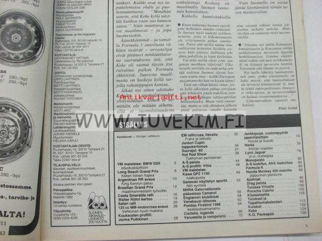 Vauhdin maailma 1982 nr 5 -mm. Porsche 911 SC Caprio, Lynx Jaguar D nostalgiaa jos mikä, Honda CM 400T ja Suzuki GS 450L, Cisitalia D.46 Tienraivaaja Italiasta, Pontiac Firebird -68 350cid, Geneve autonäyttelyn antia, 30. Safariralli, F1 Brasilia Keken voitto karvan päässä, F1 Long Beach Keke MM johtoon, BMW 520i tyyliä jo toisessa polvessa.21 x 29 cm.