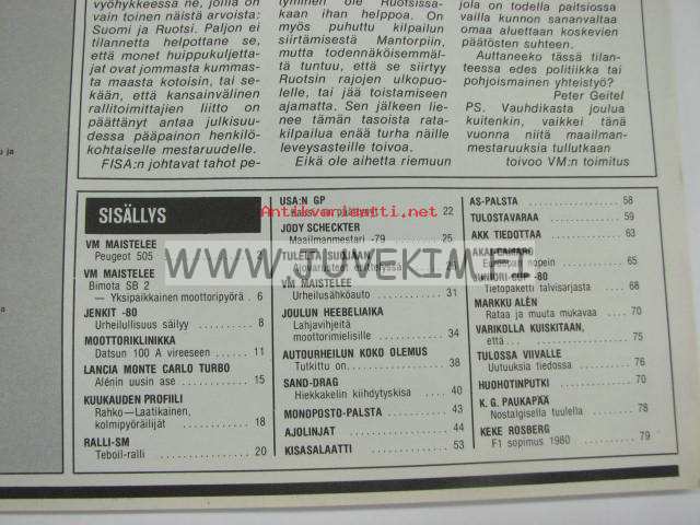 Vauhdin Maailma 1979 nr 12 -mm.Dragin Akai-Camaro Euroopan nopein, Sand Drag "perunavako GP", F1 USA GB Villeneuven tuurivoitto, RalliFormula Lancia Beta Monte Carlo Turbo R5, Peugeot 505 STI "pojasta polvi paranee", hysteriasta huolimatta jenkkisportit -80 Corvette - CamaroUltra Z turbo V8, Jody Scheckter F1 maailmanmestari.21 x 29 cm.