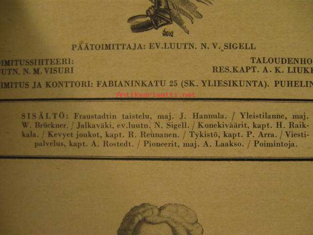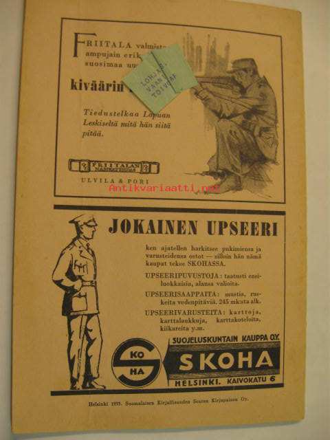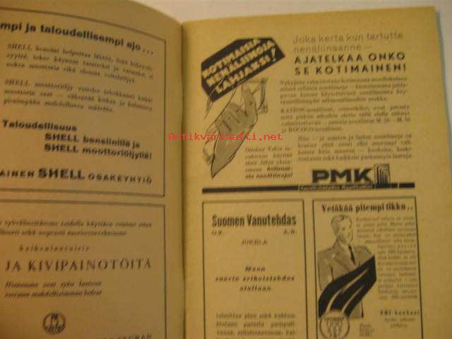 | Saatavilla | 1 kpl | | Julkaisuvuosi | 1933 | | Sivuja | 44 | | Kunto | K2 | | yhdellä sivulla repeämä | | Sidonta/painoasu | Lehti | | Kielet | Suomi |