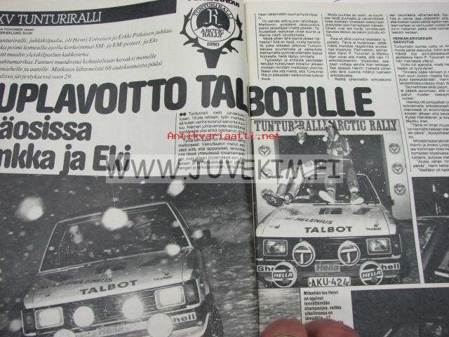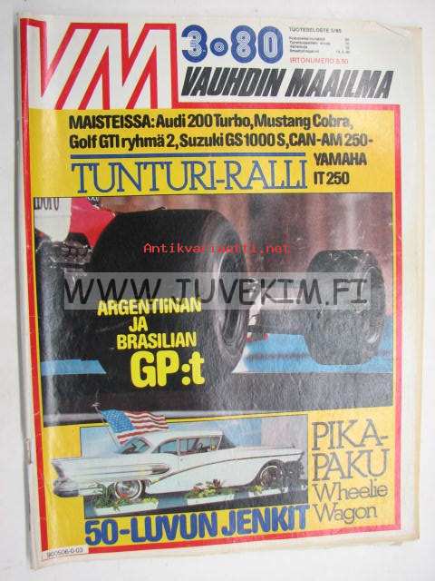 Vauhdin Maailma 1980 nr 3 -mm. Ford Mustang Cobra kesy varsa, Porsche 924 Turbo Monte Carlo valmis ase, Street Altered Lasse Linforssin Wheelie Wagon, F1 Brasilian GP, Argentiinan GP Jonesille kulta - Kekelle pronssi, XV tunturiralli, 50-luvun jenkkiautot aitoja dollarihymyjä, Suzuki GS 1000 S.21 x 29 cm.
