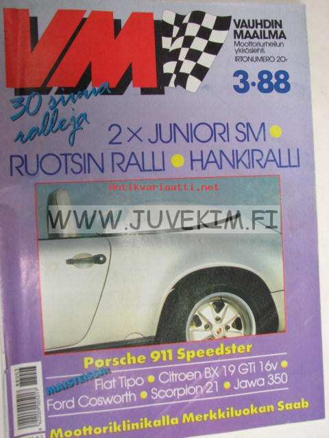 Vauhdin Maailma 1988 nr 3 -mm. Ruotsin MM-ralliRalli EM -87, A-ryhmän viritystiedettä, VM maistelee Jawa 350 -Scorpion 21 Saimaan sikari -Fiat Tipo -Citroen BX 19 GTi 16v - Ford Sierra Coswort, Porsche 911, Cajon Camaro.21 x 29 cm.
